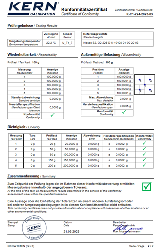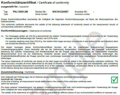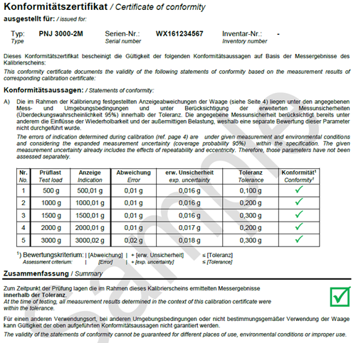 Bei der Kalibrierung werden verschiedene Charakteristiken der Waage geprüft, z.B. Außermittige Belastung, Wiederholbarkeit, Richtigkeit. Das hier gezeigte Konformitätszertifikat trifft eine Aussage zu diesen einzelnen Messergebnissen, bevor diese in die Gesamtmessunsicherheit einfließen. Dies erlaubt es z.B. Herstellerangaben abzuprüfen, jedoch keine gesamte Aussage über die Messunsicherheit künftiger Einwaagen. Es kann die Messunsicherheit einzelner Parameter nicht berücksichtigt werden. Es werden nur die direkten Messwerte (Richtigkeit, außermittige Belastung und/oder Wiederholbarkeit) ohne Berücksichtigung der Unsicherheiten mit den vorgegebenen Toleranzen (Hersteller- oder Kundentoleranz) verglichen. Das Konformitätszertifikat kann auf Grundlage einer relativen (prozentualen) oder absoluten (in mg, g, kg etc.) Toleranz ausgestellt werden. |